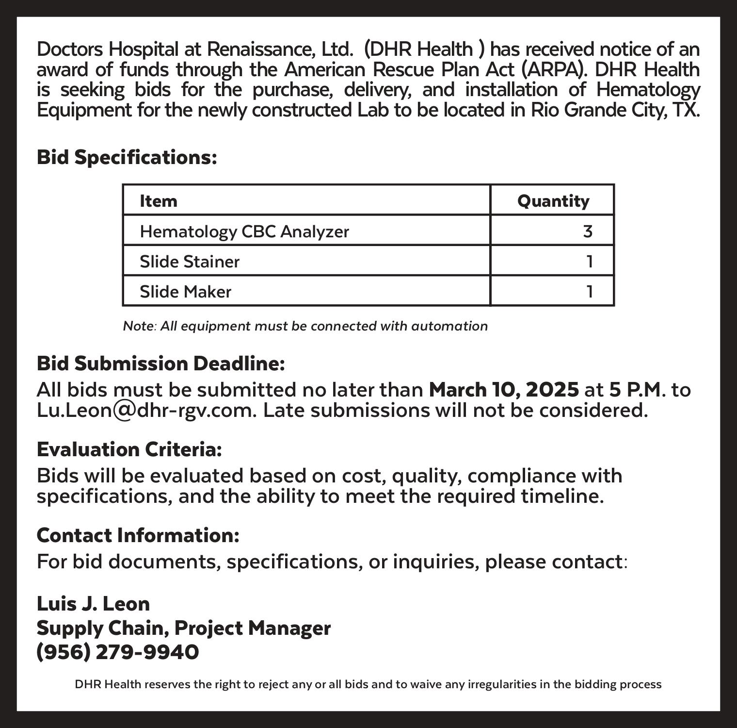 Doctors Hospital at Renaissance, Ltd. (DHR Health ) has received notice of an award of funds through the American Rescue Plan Act (ARPA). DHR Health is seeking bids for the purchase, delivery, and installation of Hematology Equipment for the newly constructed Lab to be located in Rio Grande City, TX.